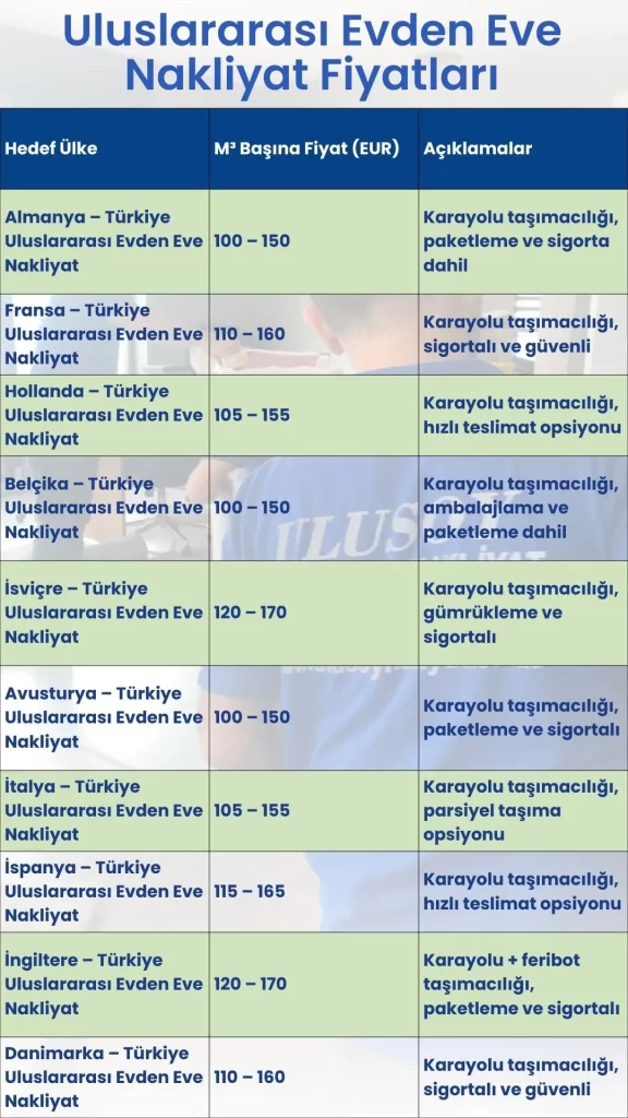 | Hedef Ülke (Uluslararası Evden Eve Nakliyat) | M³ Başına Fiyat (EUR) | Açıklamalar |